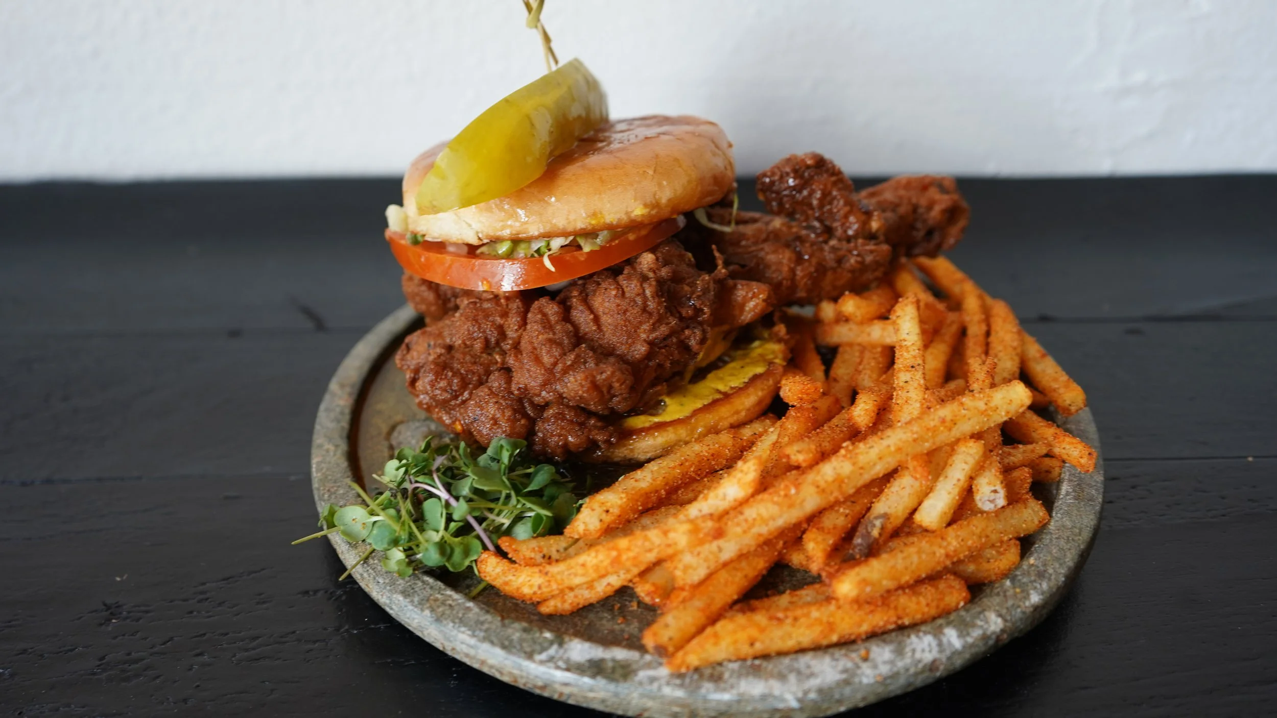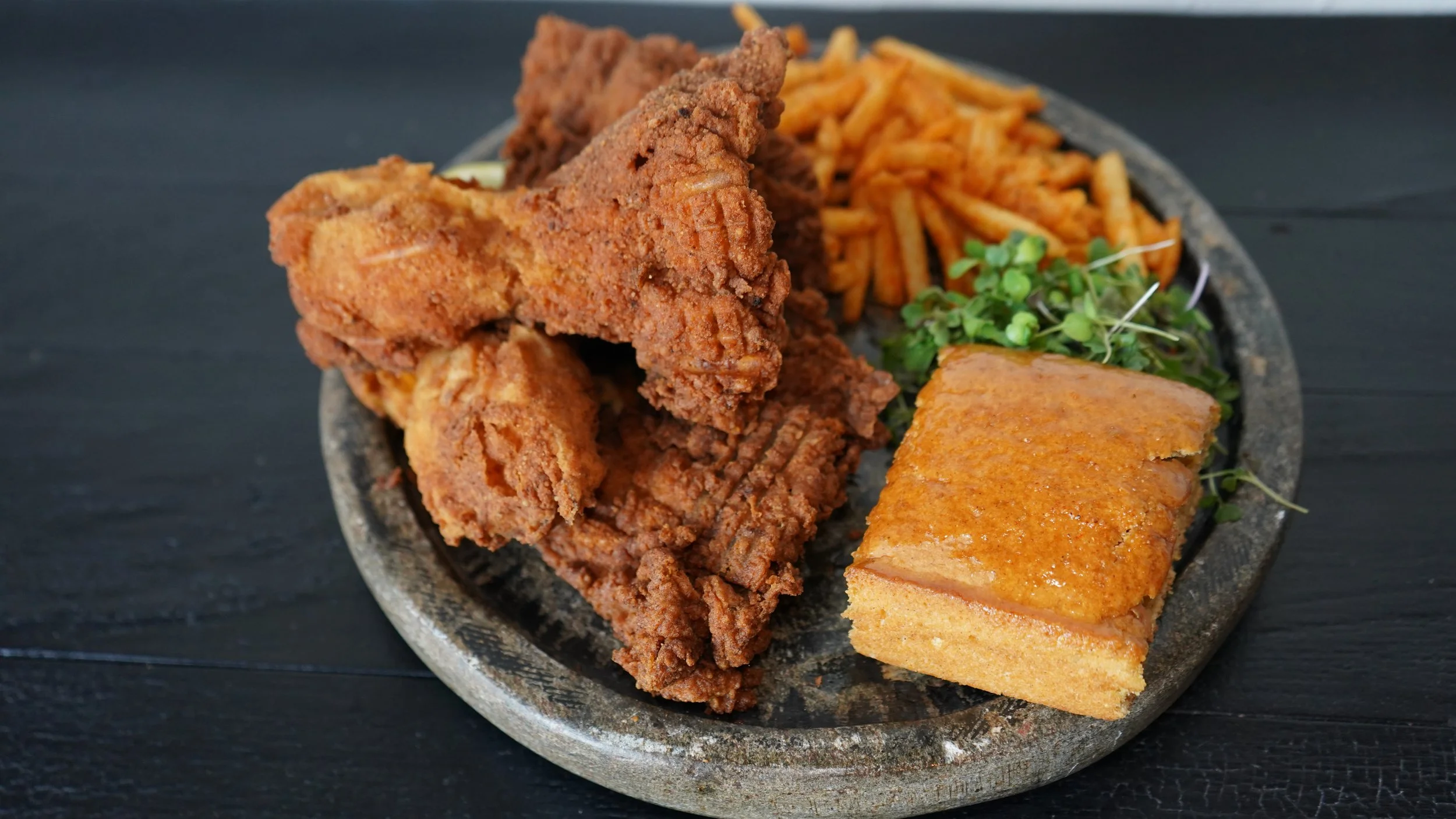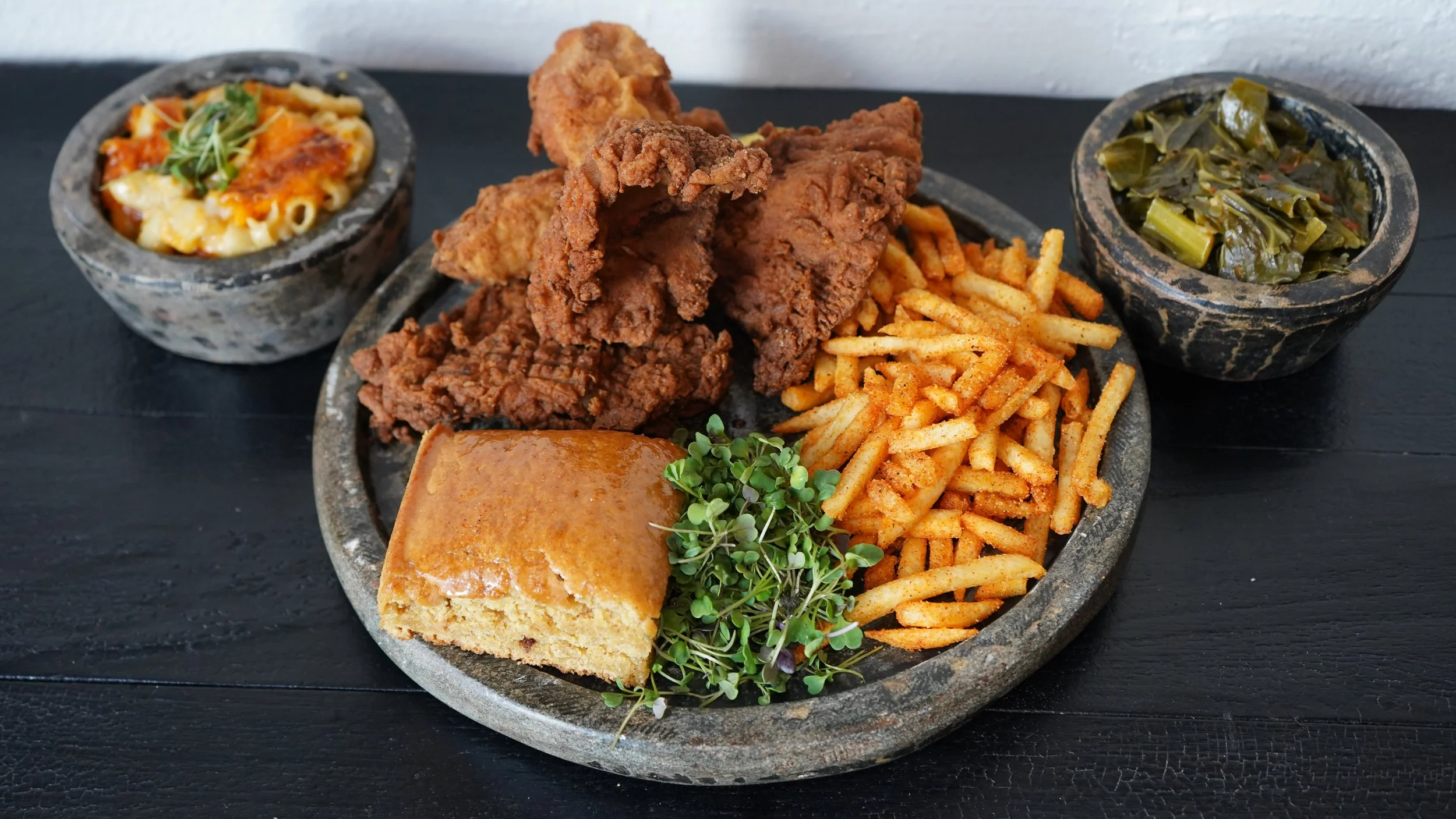 Crispy fried oyster mushrooms, baked macaroni & cheeze, collards cooked low and slow, seasoned fries, and cornbread. Comes with dipping sauce. Peak comfort.