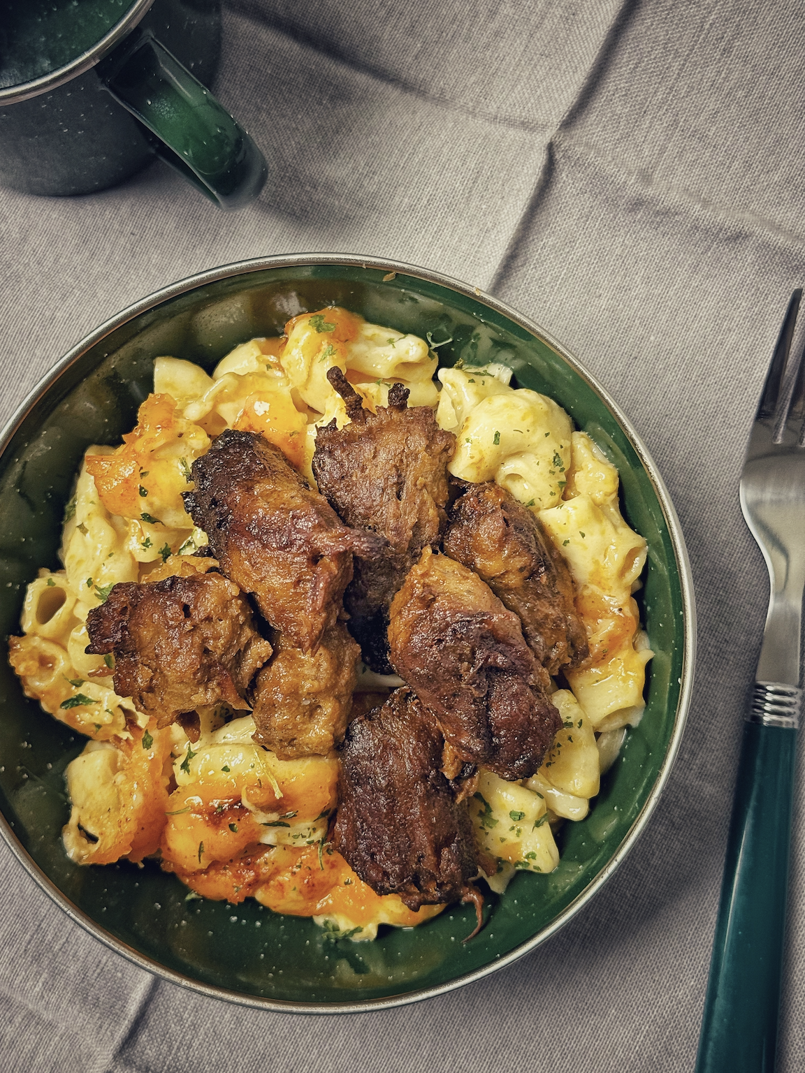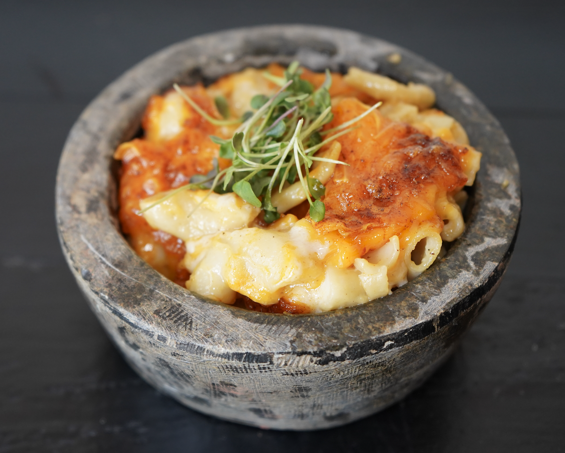 Slow-smoked burnt ends over house-baked macaroni & cheeze. Creamy underneath, smoky on top. Done right.