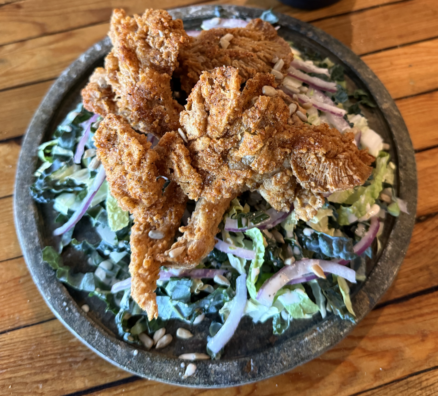 Shaved napa and kale, pickled onion, toasted sunflower seeds, crispy fried oyster mushrooms. Lemon-herb dressing to finish.