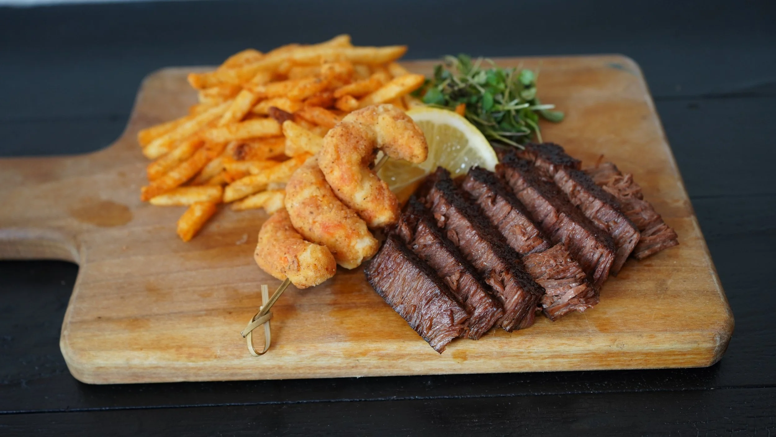 4oz sirloin steak, three golden fried shrimp, and seasoned fries. Land meets sea.